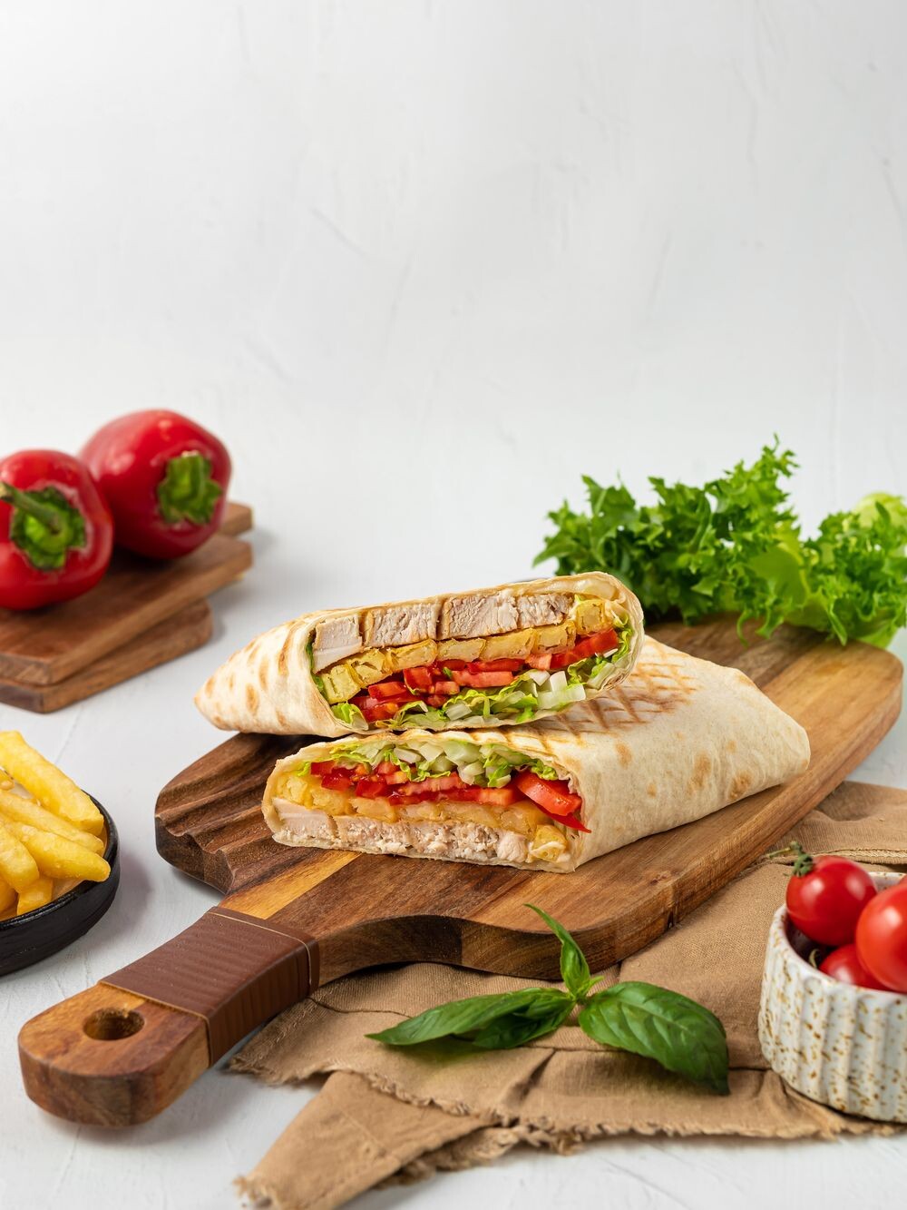 Наша фирменная шаурма с картофелем фри — это сочетание тонкого лаваша, свежих овощей, нежного мяса, картофеля фри и ароматных специй, которые создают неповторимый вкус. Мы гордимся тем, что предлагаем вам не просто перекус, а настоящее кулинарное произведение искусства.